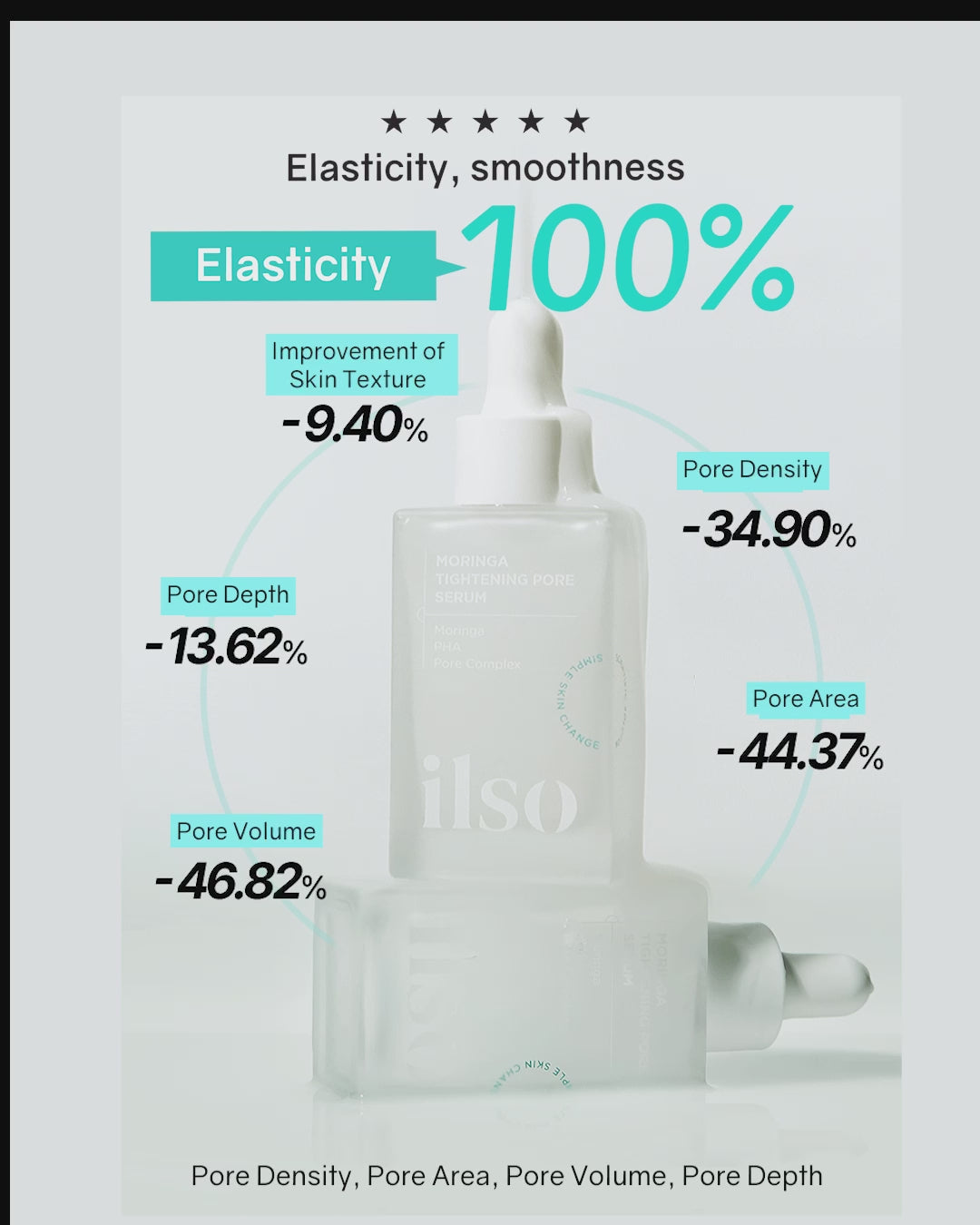 Say Goodbye to Pores with ilso's tightening pore serum. Tired of large pores and uneven skin texture? This innovative serum is here to help! With its powerful ingredients and clinically proven results, it delivers a multi-faceted approach to pore care, leaving you with a smooth, clear, and radiant complexion.