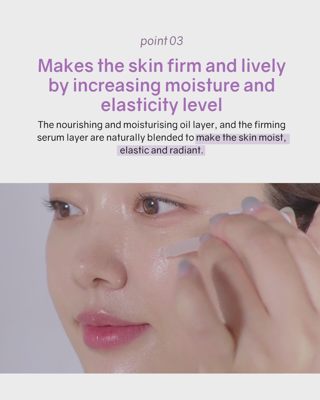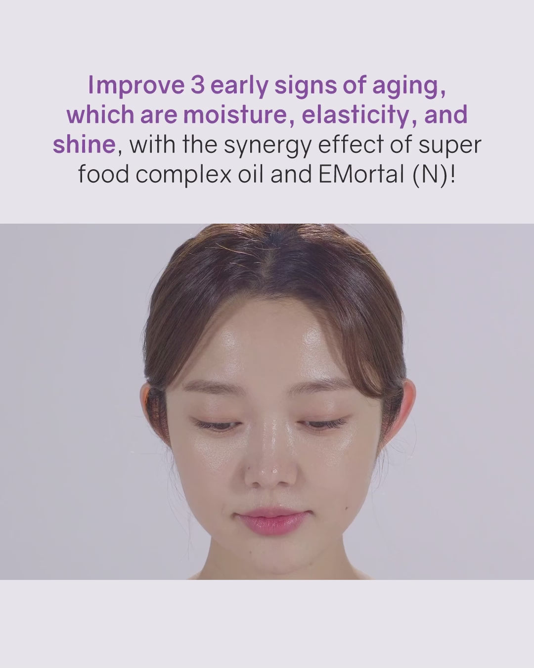 An oil serum made with 8 kinds of superfood complex and vegetable peptides to achieve clear, elastic skin and improve 3 early ageing signs — moisture, elasticity and shine. It contains oil and serum in a golden ratio of 3:7 to improve moisture and elasticity level.