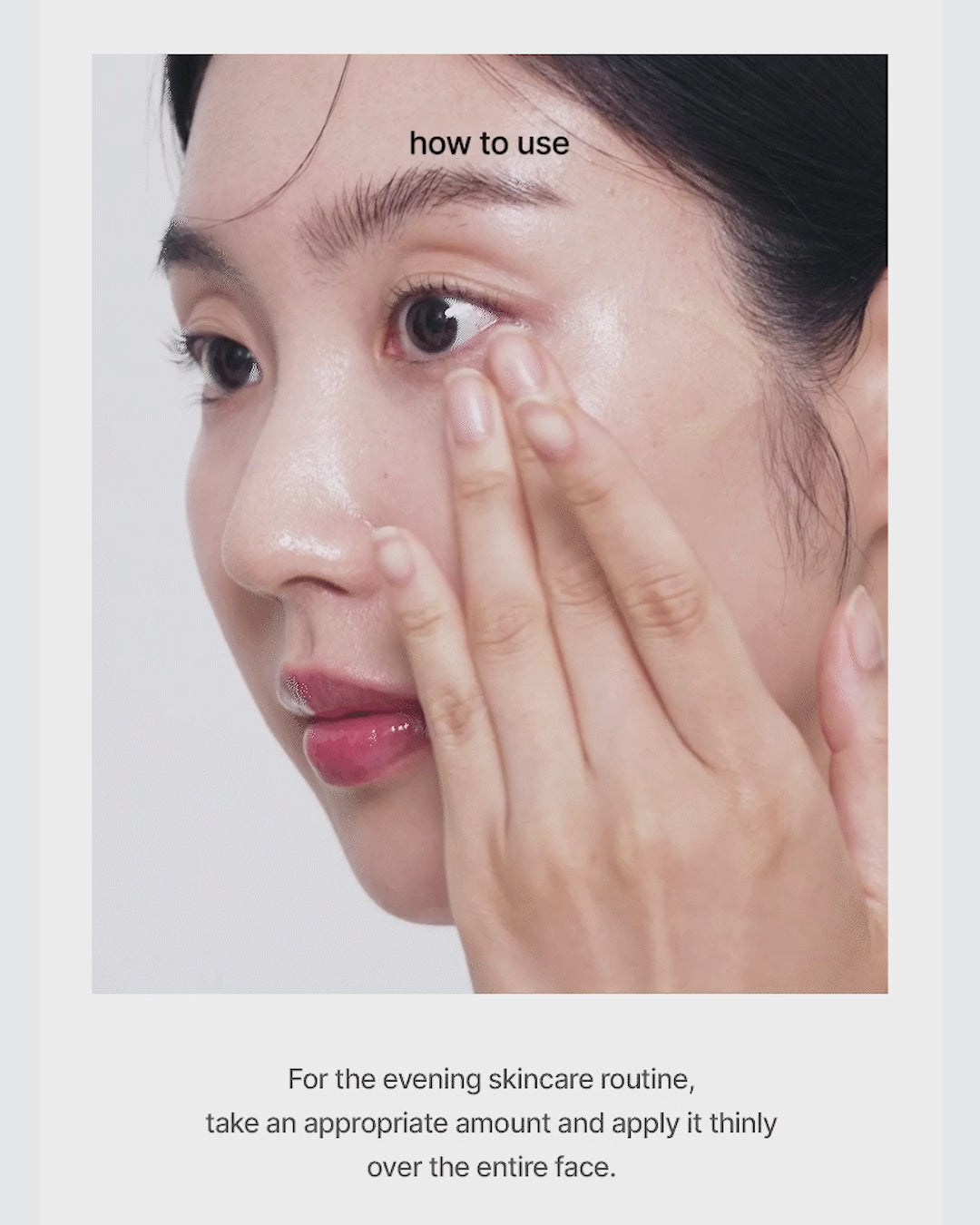 For the evening skincare routine, take an appropriate amount and apply it thinly over the entire face, then finish with a moisturiser.