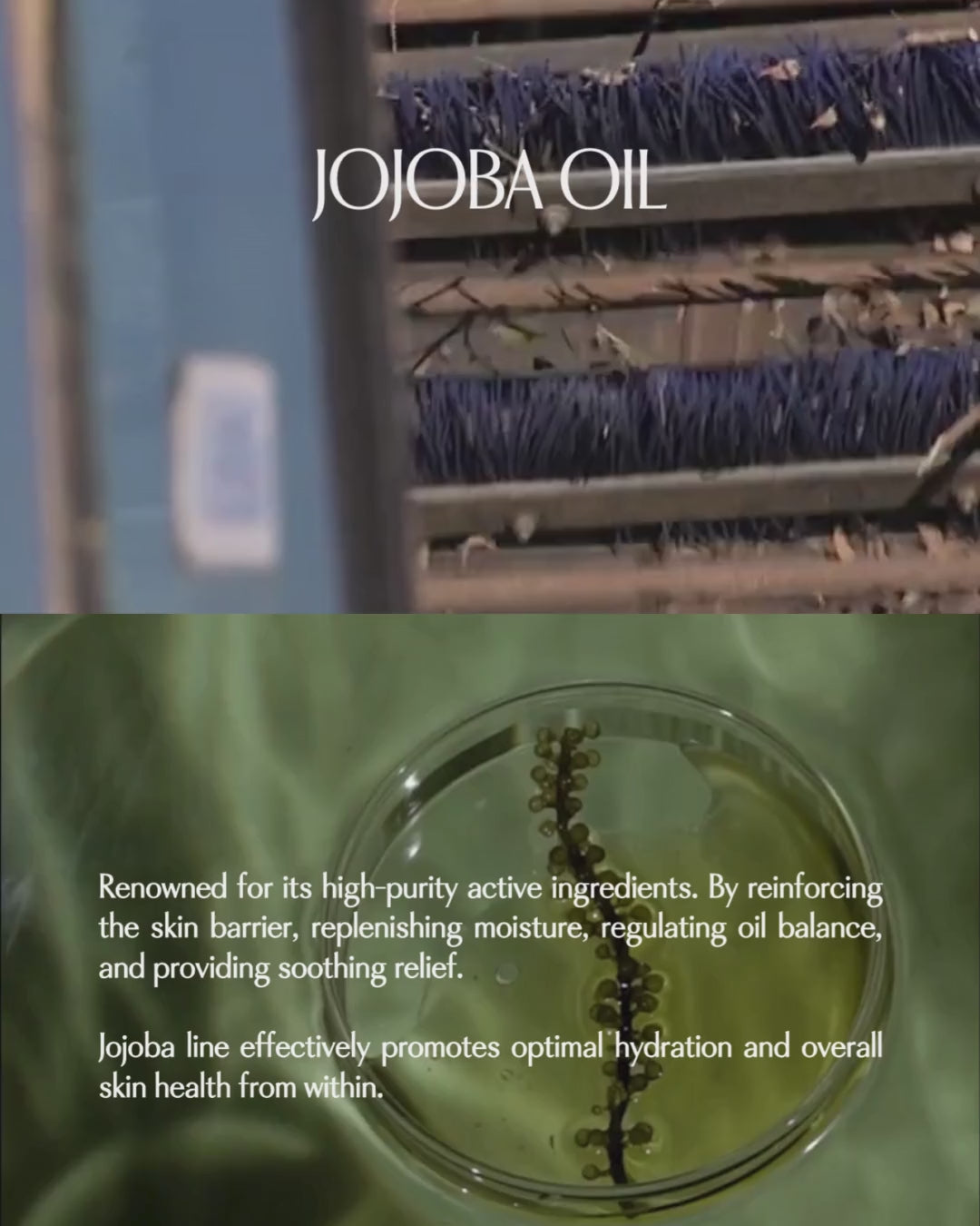 The Jojoba line is a range of essential skincare products that cater to all skin types. It features the remarkable benefits of organic golden jojoba oil, renowned for its high-purity active ingredients. By reinforcing the skin barrier, replenishing moisture, regulating oil balance, and providing soothing relief, this line effectively promotes optimal hydration and overall skin health from within. Embrace its use for 365 days of consistent daily care.